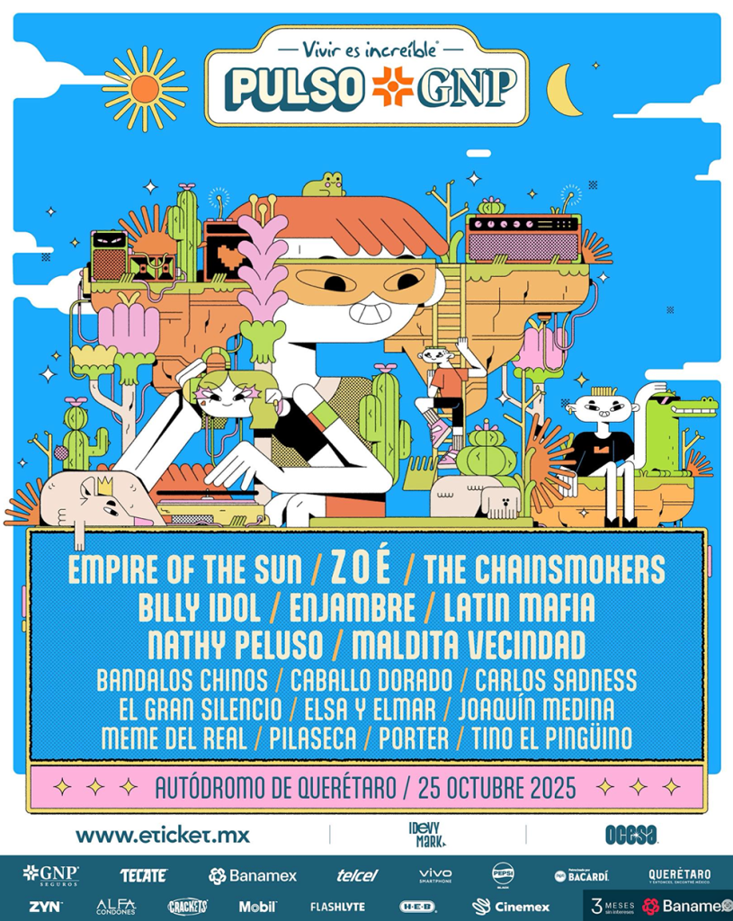 El cartel de esta edición reúne una mezcla potente de talento internacional y nacional, encabezado por Empire of the Sun, Zoé, The Chainsmokers, Billy Idol, Nathy Peluso, Enjambre, Maldita Vecindad, Latin Mafia, entre muchos otros proyectos que prometen shows memorables. Pulso GNP se ha consolidado como uno de los festivales más importantes del Bajío, combinando música, arte y experiencias pensadas para disfrutarse con amigos.